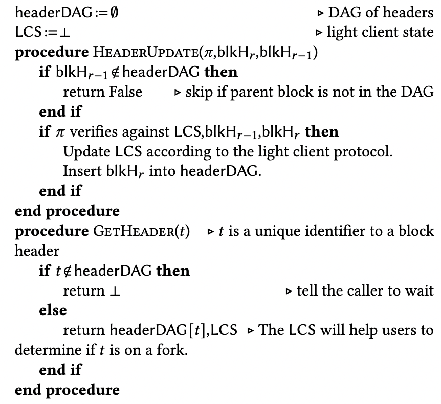 The updater contract maintains the light client’s internal state including a list of block headers of 𝒞1 in headerDAG. It has two publicly exposed functions. The HeaderUpdate function can be invoked by any block header relay node, providing supposedly the next block header and a proof as input. If the proof verifies against the current light client state LCS and blkH𝑟−1, the contract will do further light-client checks, and then the state will be updated accordingly. Since the caller of this function must pay a fee, DoS attacks are naturally prevented.
